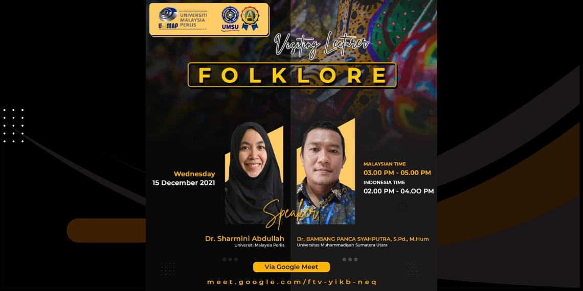 Pada tanggal 15 Desember 2021, Universitas Muhammadiyah Sumatera Utara (UMSU) bekerja sama dengan Universiti Malaysia Perlis (UNIMAP) menyelenggarakan sesi Dosen Tamu yang menarik dengan tema “Folklore”. Acara akademik lintas budaya ini menghadirkan perwakilan dari kedua universitas: Sharmini Abdullah dari UNIMAP dan Dr. Bambang Panca Syahputra, S.Pd., M.Hum, dari UMSU. Setiap pembicara membawa perspektif yang unik, dengan fokus pada cerita rakyat dan kearifan tradisional dari budaya masing-masing, memperkaya pemahaman mahasiswa tentang beragam akar cerita rakyat dan pentingnya budaya dalam kehidupan sehari-hari.